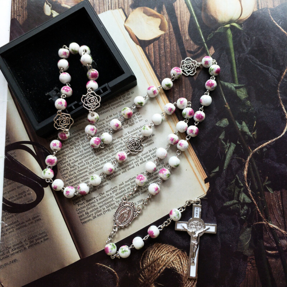 In this rosary, one decade’s larger beads are replaced with soft pink roses.